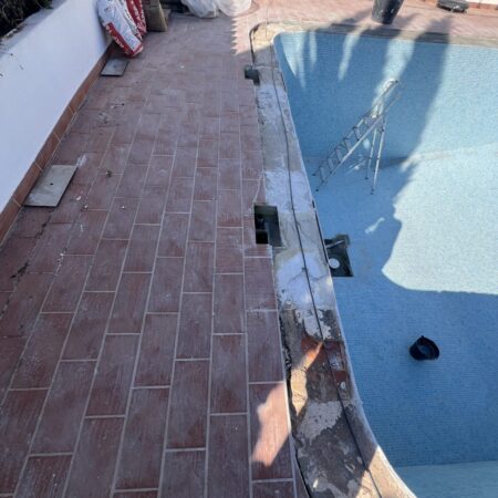 First we removed the old stone coping of the pool, then we levelled everything and lastly we installed the new natural stones.