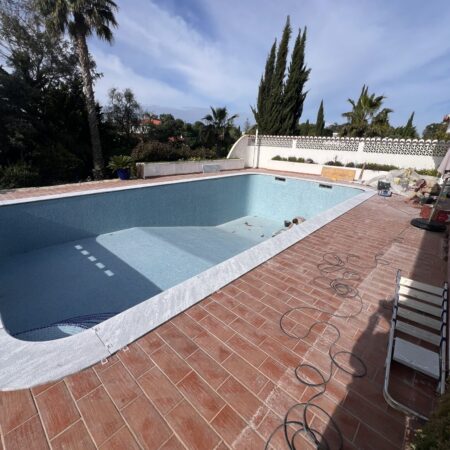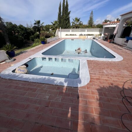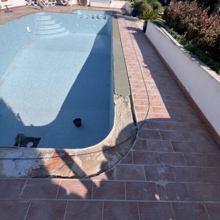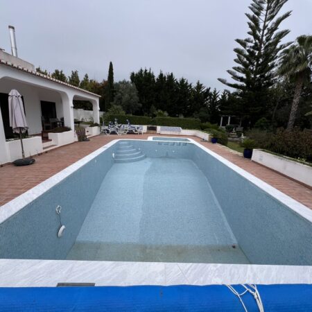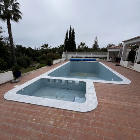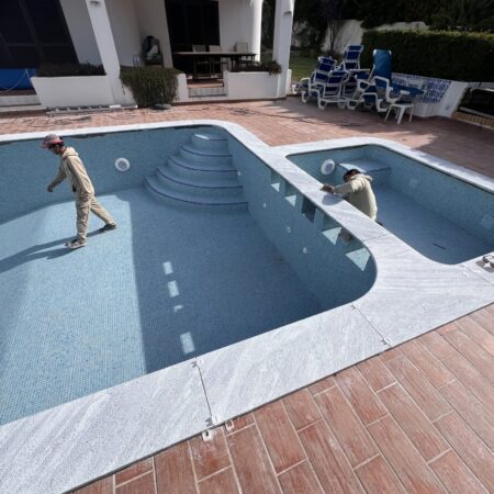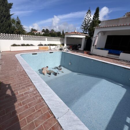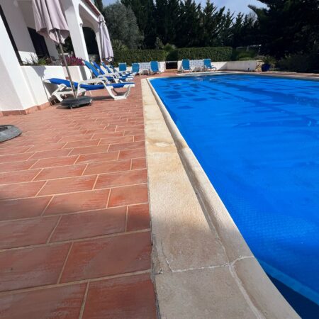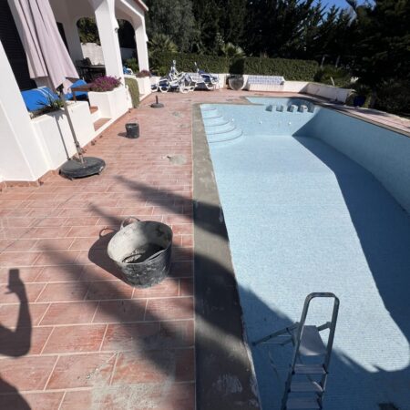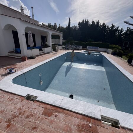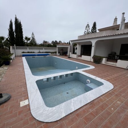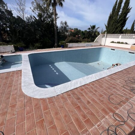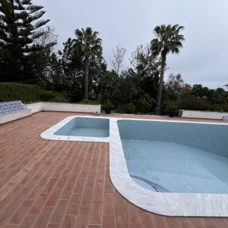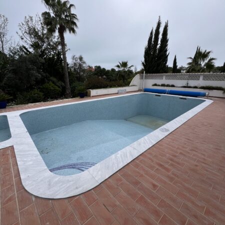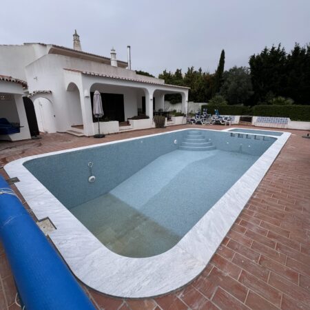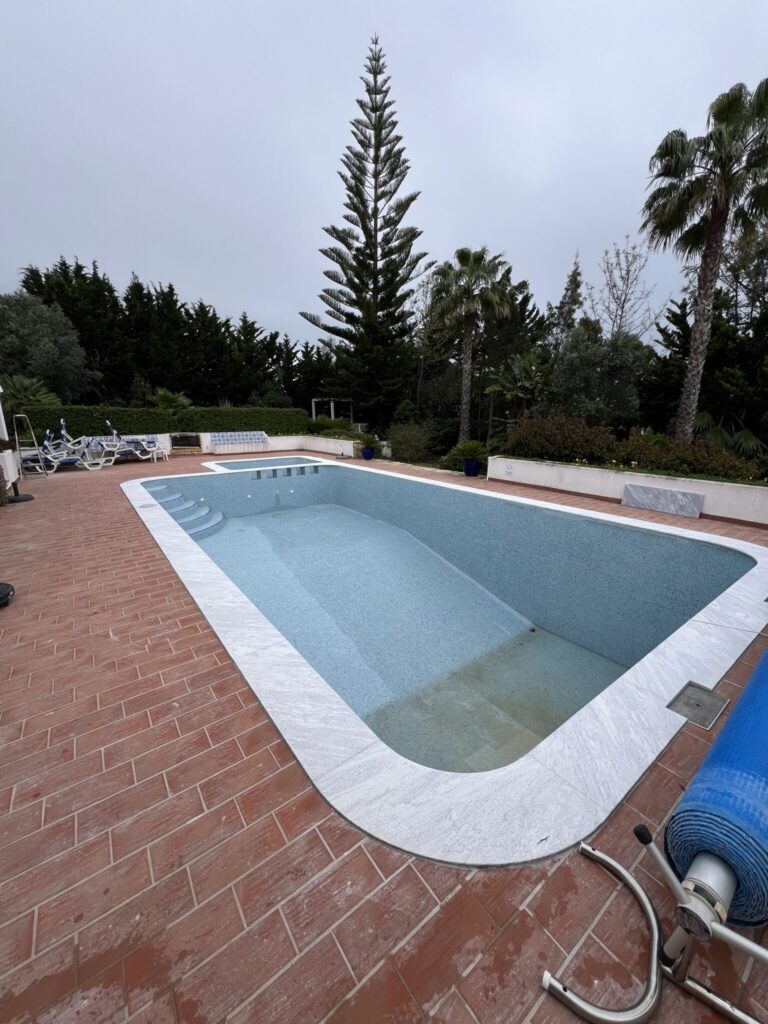 For this client in Carvoeiro, we replaced the pool coping with new Mármore Azul natural stones.