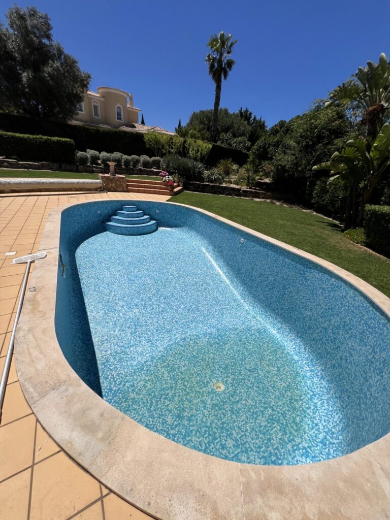 We stored the pool water in special water bags to allow for reuse. All existing pool tiles were removed, and the old adhesive was thoroughly sanded off. After that, the entire pool was insulated using mesh and three layers of insulation. Finally, the pool was completely retiled and grouted for a clean and durable finish.